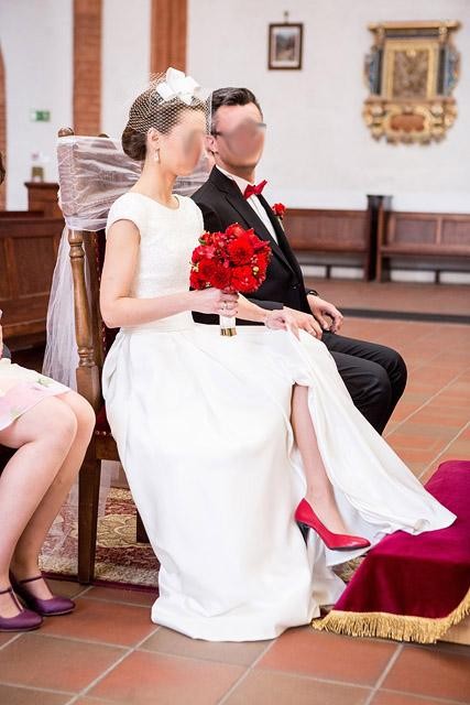 - dół sukni – 100% jedwab. Materiał się swobodnie układa, nie jest ciężki. Rozcięcie znajdujące się na środku jest bardzo wygodnym i efektownym rozwiązaniem. Pięknie układa się w tańcu. Suknia posiada również ciekawy dodatek – kieszenie:)