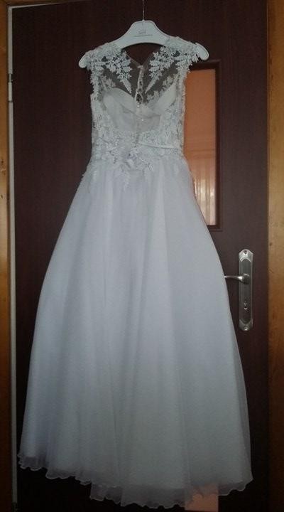 Góra zrobiona z koronki z tyłu zapina na guziki dół zrobiony z jedwabiu muślin.Kolor biały.Suknia pięknie się układa i jest lekka. Rozmiar 36 wzrost 155 cm +9,5 cm obcas. Suknia założona dwa razy ślub i sesja zdjęciowa wyprana w pralni chemicznej. Cena 2000 zł do negocjacji