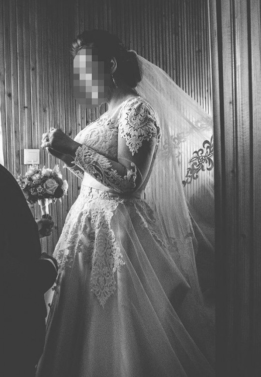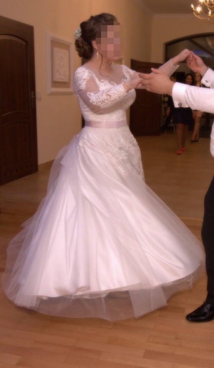 Suknia posiada niewielki i nieproblematyczny, aczkolwiek efektowny tren wykończony haftem (na zdjęciach słabo widoczny, zainteresowanym doślę więcej fotek;)). Hafty w sukni są niezwykle miękkie co sprawia, że rękawy są bardzo przyjemne w noszeniu i nie "drapią" oraz nie są sztywne.