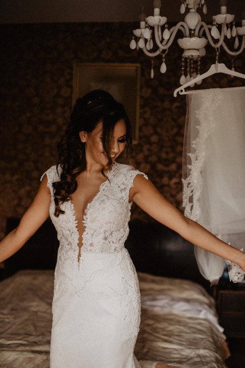 Sukni nie trzeba opisywać, dbałość o najmniejszy detal, delikatność i lekkość sprawią, że każda Panna Młoda będzie wyglądać po prostu przepięknie. Suknia jest bardzo elastyczna, mimo, że ściśle przylega do ciała, pracuje i w żadnym wypadku nie ogranicza ruchów. Posiada również piękny tren, który bez problemy można przypiąć na czas zabawy weselnej.
