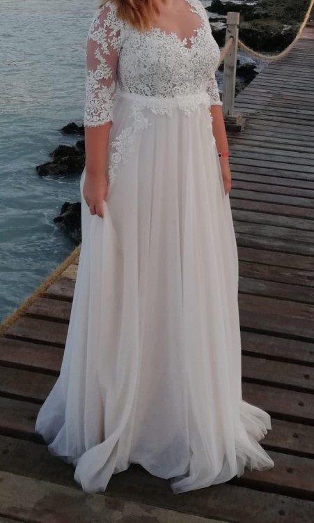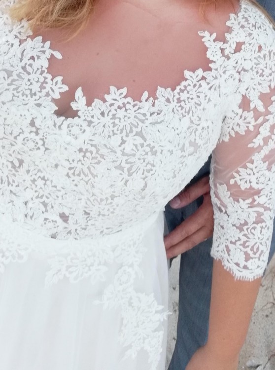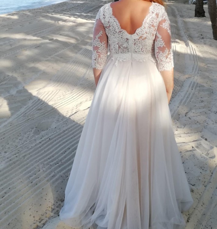Sprzedam oryginalną suknię ślubną, szyta na miarę u projektantek z Place for Dress. Suknia stylizowana na suknię Maggio Ramatti model Kasey. Suknia wykonana z wysokiej jakości materiałów - koronki hiszpańskiej oraz wysokogatunkowego, niegniecącego się tiulu. Sukienka z pięknym wycięciem na plecach. Zapinana z tyłu na zameczek Ręcznie zagęszczana koronką na rękawach i dekolcie. Pięknie układa się w tańcu, jest bardzo lekka i zwiewna. Sukienka dzięki elastycznym rękawom pasuje na rozmiar 40/42, na osobę około 170 + obcas. Suknia zachwyciła wszystkich gości swoją elegancją a zarazem lekkością i zwiewnością.