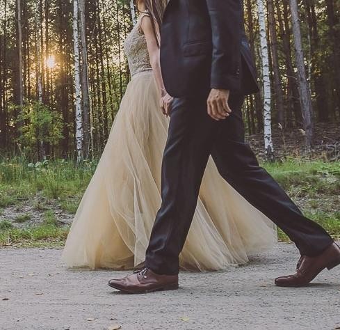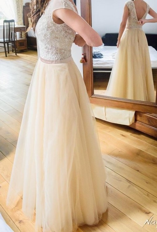 Mam do sprzedania piękną jedyną w swoim rodzaju suknię ślubną w kolorze szampańskim. Jedyną ponieważ była szyta na zamówienie wg indywidualnego projektu. Sukienka jest wykonana z najwyższej jakości materiałów- góra wykonana z koronki francuskiej naszywanej ręcznie na delikatnej siateczce , spódnica wykonana z wielu warstw zwiewnego tiulu jedwabnego, który przepięknie się unosi podczas ruchu. Sukienka jest bardzo wygodna, ponieważ nie jest w żaden sposób usztywniana. Można założyć ze spokojem cielisty stanik lub wkładki sylikonowe, ponieważ w miejscu gdzie przypada bielizna, są pięknie naszyte elementy koronki.