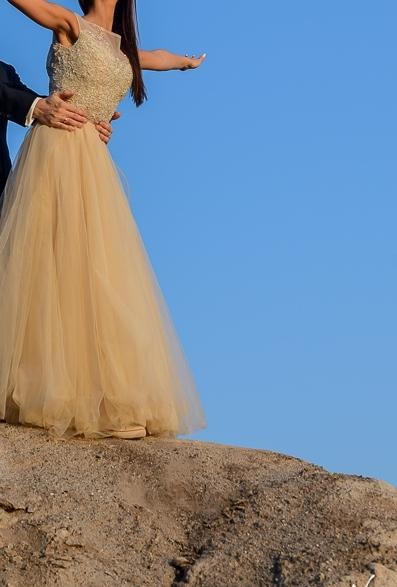Oryginalna, zwiewna suknia w kolorze szampańskim
