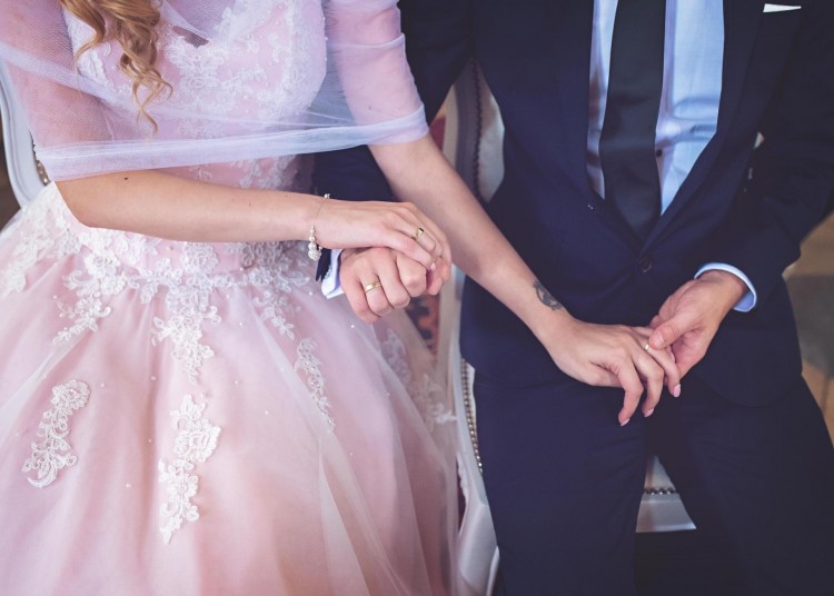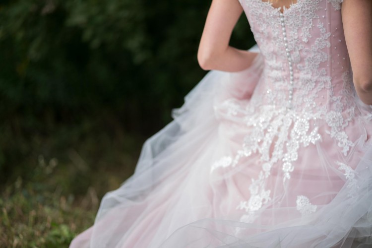 Orygnialna pudrowo-różowa suknia ślubna, perły