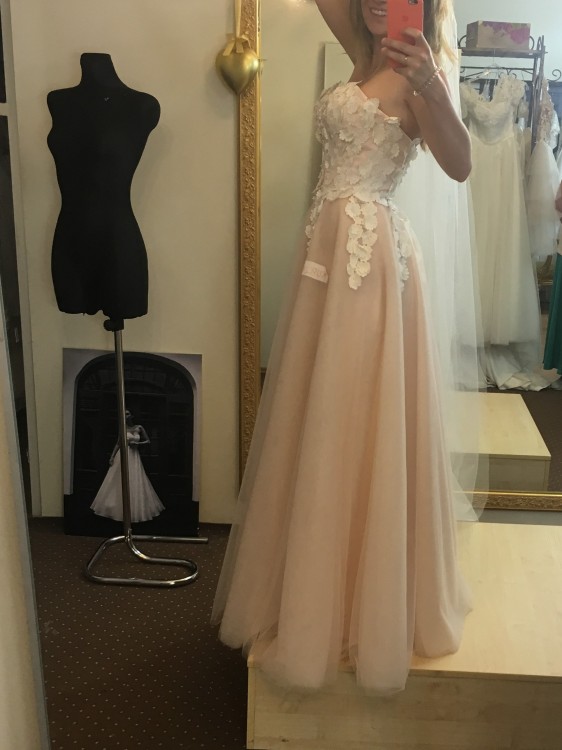 Górę sukni stanowi gorset obszyty oryginalnymi, delikatnymi kwiatami, zapinany na suwak, bardzo przyjemnie wykończony, doskonale trzymający górę bez obaw, że cokolwiek się obsunie. Natomiast dół sukni składa się z kilku warstw delikatnego tiulu na pastelowym tle. Nie ma koła, przez co suknia przepięknie i naturalnie układa się w ruchu, jednocześnie jednak nie plącząc się między nogami.