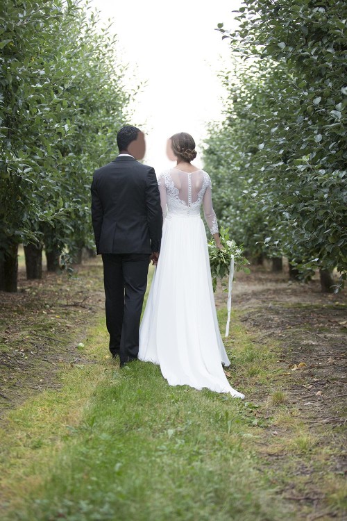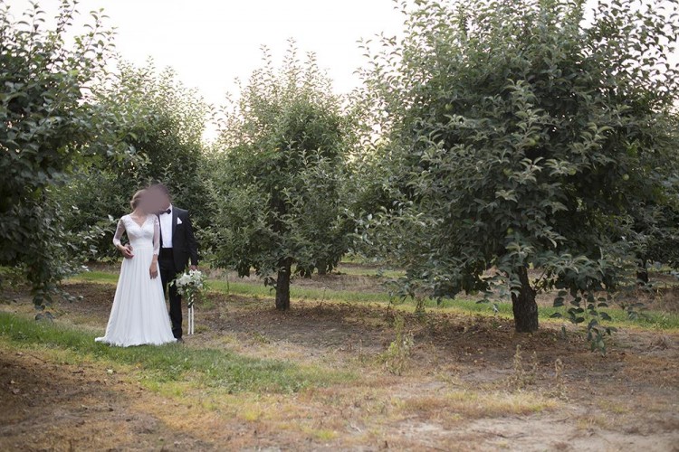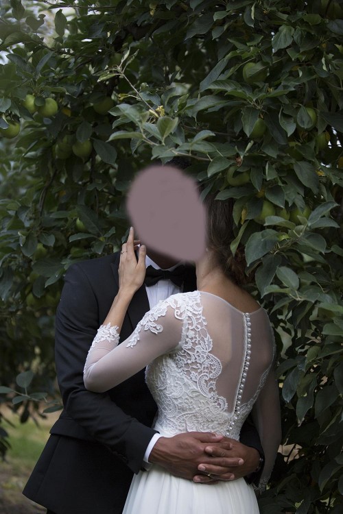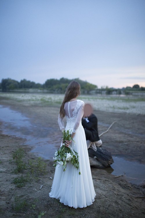 Suknia jest o rozmiarze 34/36, w odcieniu "złamanej", czyli nieintensywnej bieli na wzrost 168 cm + obcas. Zbudowana jest na górze z gorsetu i koronki, a delikatny pasek materiałowy (który można usunąć według uznania) oddziela od pięknego muślinowego dołu. We wszytej halce jest koło, które z łatwością można wyciągnąć. Można zatem osiągnąć efekt większej zwiewności (na zdjęciach suknia miała koło). Tył sukni jest zabudowany, elegancji dodają perłowe guziczki.