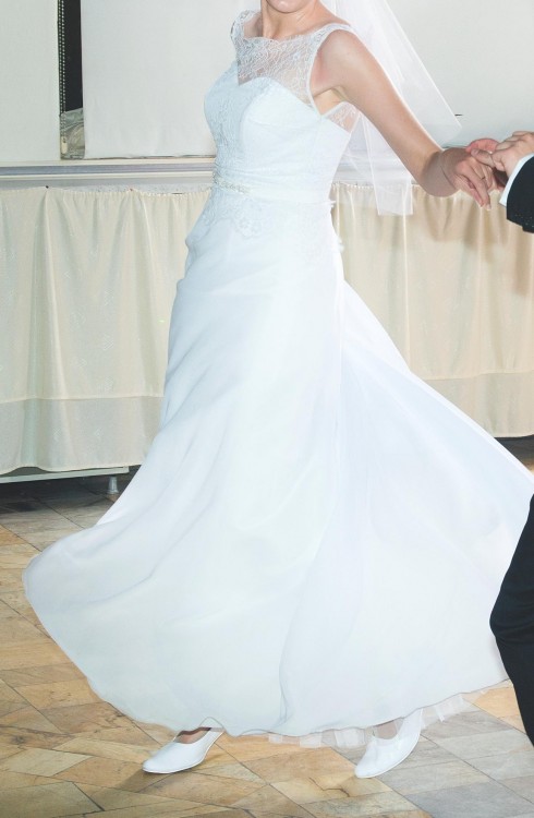 Sprzedam suknię ślubną kupioną w salonie Anabelle w Opolu - kolor biały, r. 38 na wzrost ok. 175 cm plus 5 cm obcas.