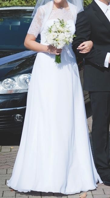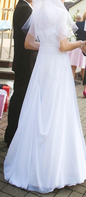Dodatkowym elementem jest bolerko, które widać na zdjęciach i które dodaję do sukni wraz z welonem (60 cm) gratis. W komplecie również halka na kole.