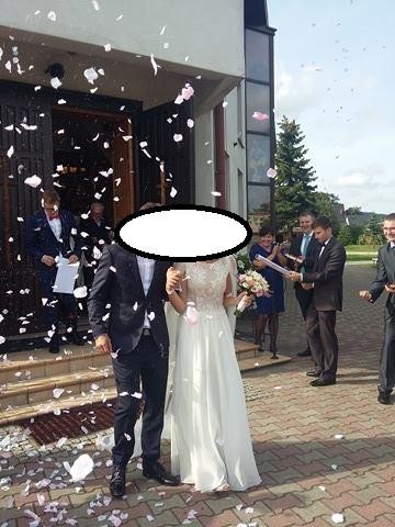Sprzedam piękną suknię ślubną w kolorze Ivory z odkrytymi plecami. Góra sukni wykonana z francuskiej koronki, dół to pięknie układający się muślin. Suknia była szyta na miarę w jednym z gdyńskich salonów sukien ślubnych. Długość sukni do obcasa 8,5 cm to 111 cm, mam 163 cm wzrostu, na co dzień noszę rozmiar XS/S. Istnieje możliwość zwężenia i dopasowania sukienki.