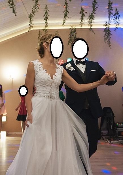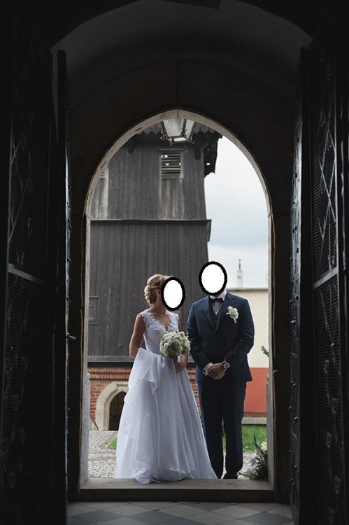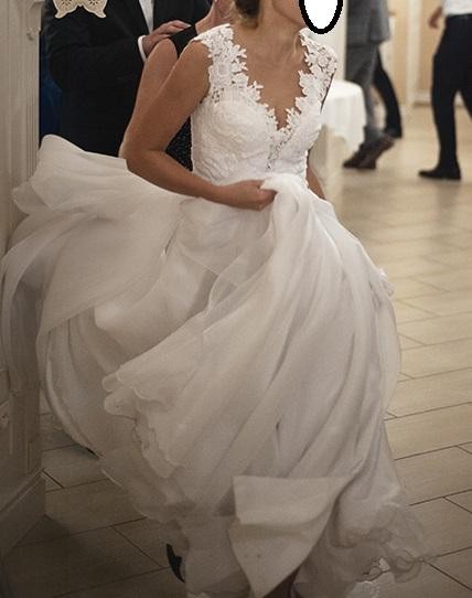 Sprzedam piękną, białą suknię ślubną szytą na wzrot 167 cm +6 cm obcas. Góra sukni wykonana jest z delikatnej koronki. Dół sukni uszyty jest z wielu wartst jedwabnego muślinu który pięknie prezentuje się w tańcu i sprawia wrażenie objętości, mimo że suknia nie jest niczym usztywniana i dzięki temu lekka. Pas zaznaczony jest delikatnymi kryształkami podkreślającymi talię. Suknia posiada dopinany na guziczki tren. Miałam ją na sobie raz podczas wesela, a następnie została wyczyszczona i czeka na nową właścicielkę.