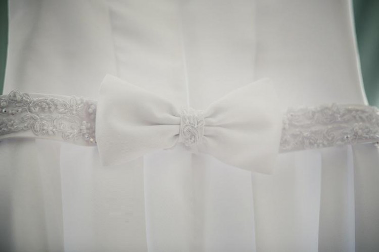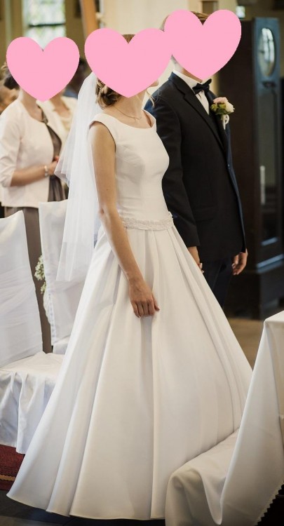 Mam na sprzedaż piękną suknię ślubną. Założona dwa razy: podczas ślubu, oraz sesji plenerowej. Niezniszczona, jak nowa! Rozmiar 36/38. Szyta na 170cm + 5 cm obcas. Materiał mikado. Dekolt w łódeczkę. Bardzo klasyczna. Jedyny element błyszczący to pasek wyszywany koralikami z kokardą z tyłu. Możliwość odczepienia kokardy. Bardzo wygodna i efektowna! Polecam!