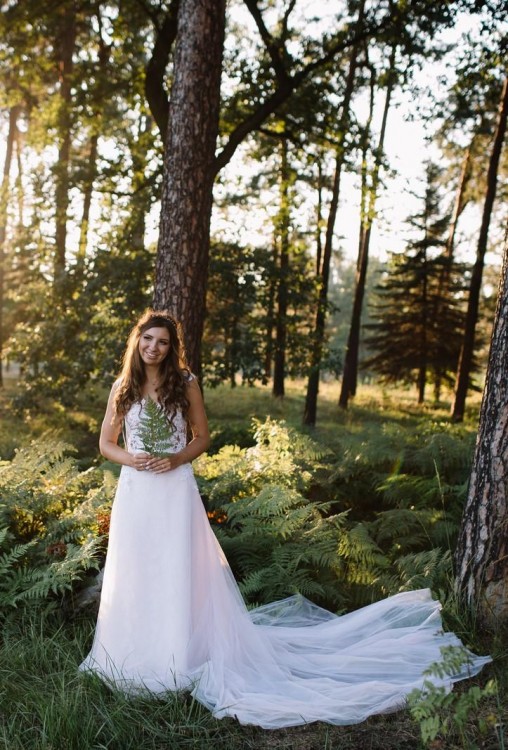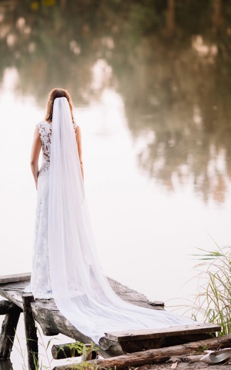 Piękna ponadczasowa koronkowa suknia ślubna z nakładaną tiulową spódnicą z trenem w kolorze blush oraz długi biały welon.