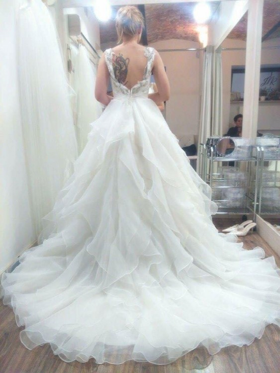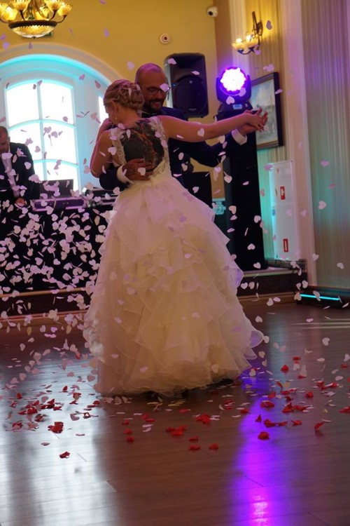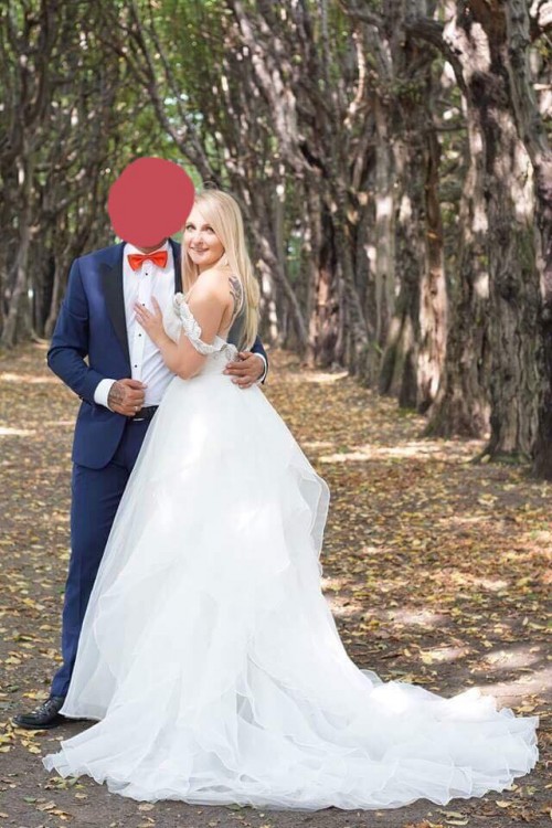 Lekka, zwiewna i pięknie układająca się w tańcu suknia. Spódnica zapinana na zamek, z przodu gładka a z tyłu w formie hiszpańskich fal podpinany tren, gorset sukni jest bandażowy. Suknia bardzo dobrze prezentuje się zarówno z kołem jak i bez. Idealna suknia dla Pań z większym biustem i wąską talią – nie ma potrzeby zakładania biustonosza. Ramiączka zdobione kamieniami i cyrkoniami, dzięki czemu pięknie mieni się w słońcu i wspaniale prezentuje się na filmie/zdjęciach, oprócz tego ramiączka doskonale podtrzymują całą suknię. Jedyną zmianą wprowadzoną przeze mnie jest zlikwidowanie połączenia na plecach między ramiączkami. Suknia do oglądnięcia/przymierzenia po 18.09.2017. Suknia jest wyczyszczona oraz wyprasowana- gotowa do założenia.