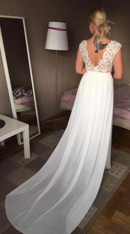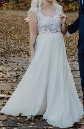Suknia ślubna z odpinanym trenem i wycięciem na plecach. Szyta na miarę na osobę 160cm. Góra z ręcznie naszywanej gipiury, dół z muślinowego materiału. Zwiewna, lekka, wygodna.