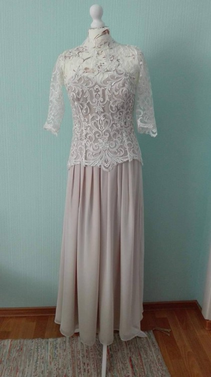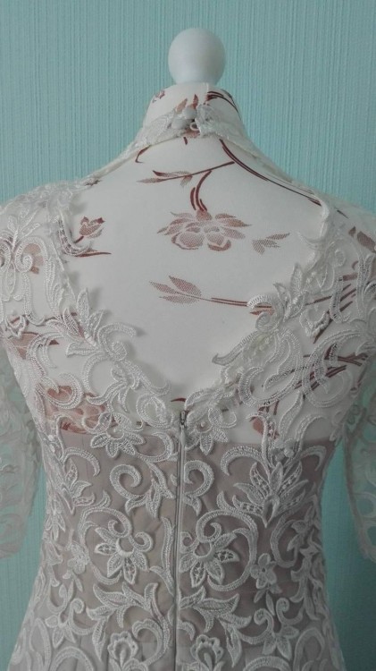 Suknia była szyta na indywidualne zlecenie, więc jest jedyna w swoim rodzaju. Piękna stójka oraz "łezka" na dekolcie" podkreśli charakter panny młodej. Śmietanowa biel przełamana jest kolorem nude. Zwiewny materiał dodaje lekkości i jest wygodny w tańcu.