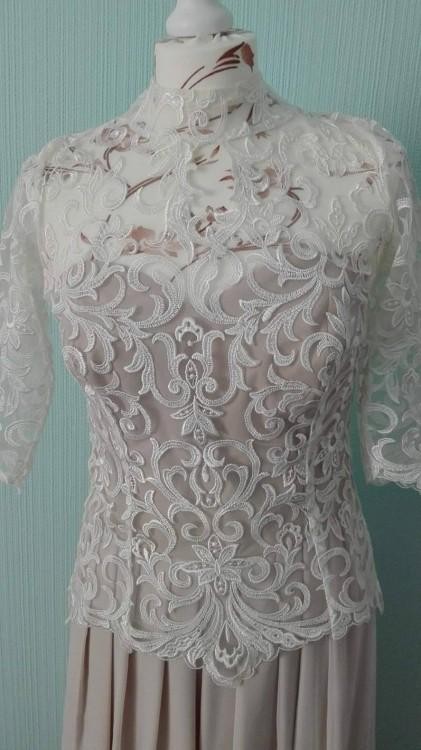 Suknia była szyta na indywidualne zlecenie, więc jest jedyna w swoim rodzaju. Piękna stójka oraz "łezka" na dekolcie" podkreśli charakter panny młodej. Śmietanowa biel przełamana jest kolorem nude. Zwiewny materiał dodaje lekkości i jest wygodny w tańcu.