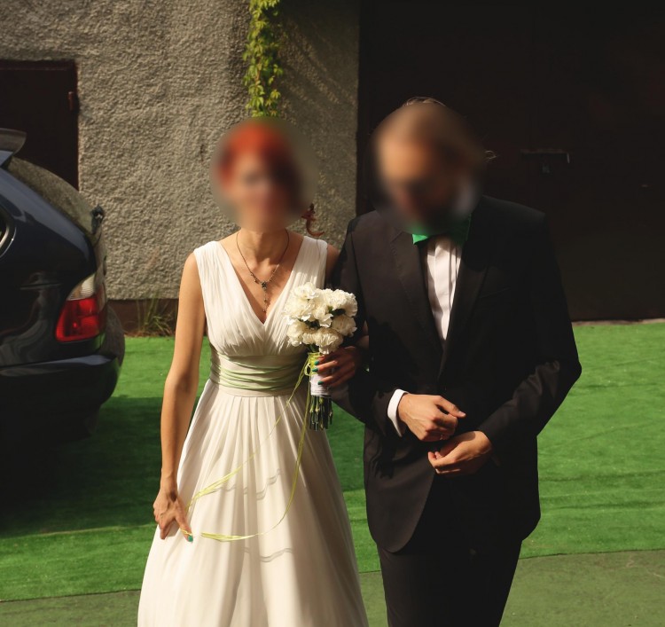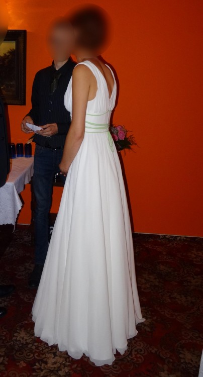 Suknia szyta na miarę według własnego projektu. Góra delikatnie podkreśla dekolt, wokół talii zawiązana zielona wstążka (można przeszyć na dowolny kolor), dół prosty uszyty z połowy koła, w związku z czym cudownie się kręci. Suknia ma kilka warstw, każdą można bezproblemowo odszyć - według uznania.