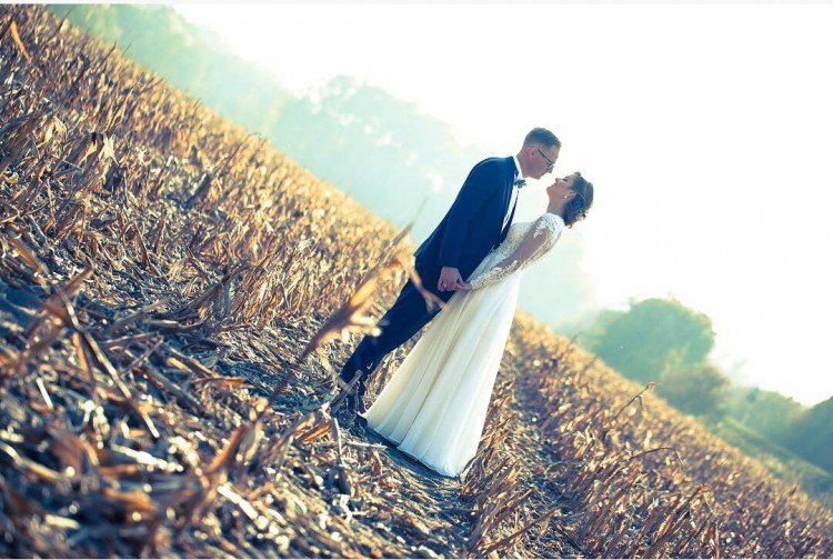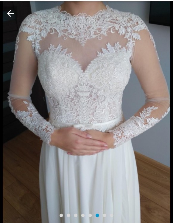 Suknia ma muślinowy dół, bez koła. Ma długi rękaw wykonany z siateczki, wykończony koronką. Posiada również siateczkowy tył i koronkowe obszycie przy dekolcie oraz na plecach.