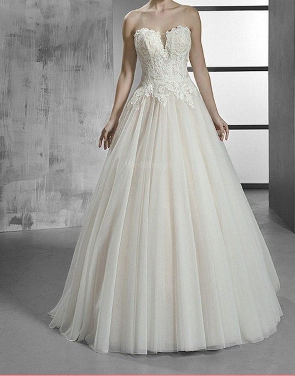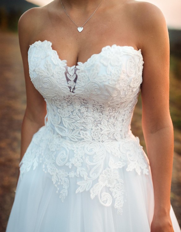 Suknia jest modelem który widnieje na zdjęciu 5, jednak w rzeczywistości jest koloru białego oraz ma naszyte hafty na dekoldzie, żeby czuć się swobodnie.