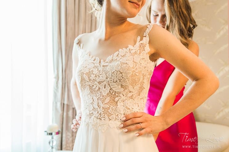 Górę sukni tworzy subtelna, niewidoczna siateczka obszyta piękną gipiurą. Dół sukni uszyty z muślinu jedwabnego.