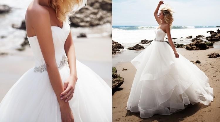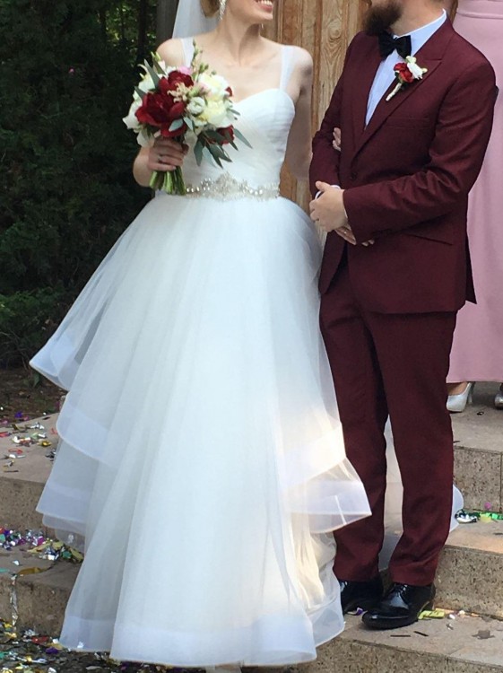 Suknia ma doszyte ramiączka, które można z łatwością odpruć, ale dzięki nim suknia trzyma się na miejscu na 100%.