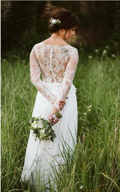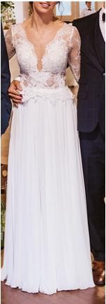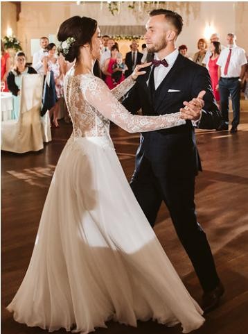 Góra sukni wykonana jest z drobnej, niegryzącej koronki, która bardzo fajnie "pracuje" podczas poruszania się. Miseczki wszyte, dekolt "wzmocniony" niewidoczną siateczką, dzięki czemu nie ma obaw, że goście zobaczą więcej niż byśmy sobie życzyły ;) Dół muślinowy, pięknie układający się podczas tańca. Mierzyłam wiele sukien z długim rękawem i ta zdecydowanie była najwygodniejsza.