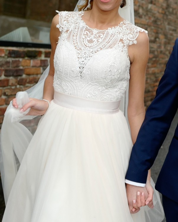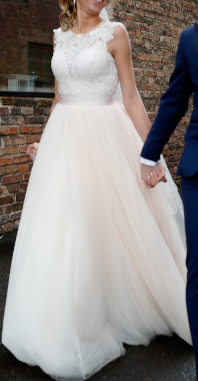 Spódnica jest niezależna od góry dzięki czemu łatwo dopasować rozmiar (wystarczy przeszyć haftki). Zapraszam do kontaktu i mierzenia. Do sukni dorzucam krótki welon gratis.