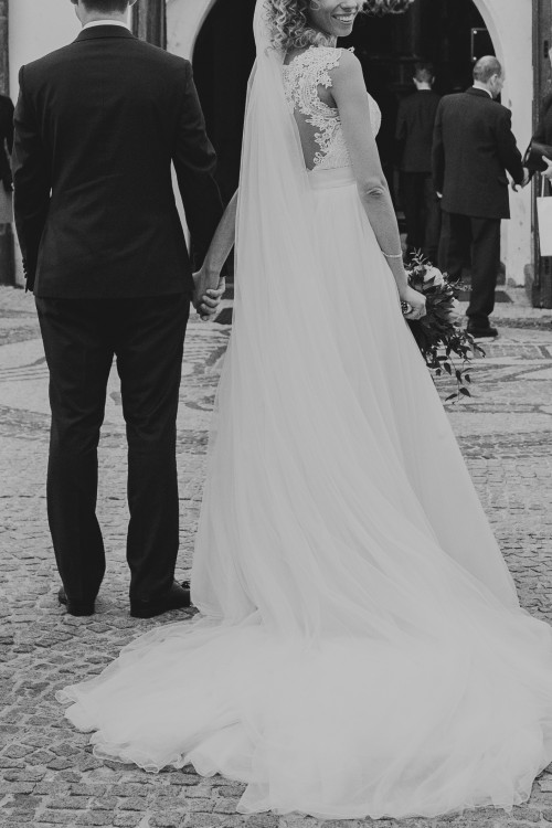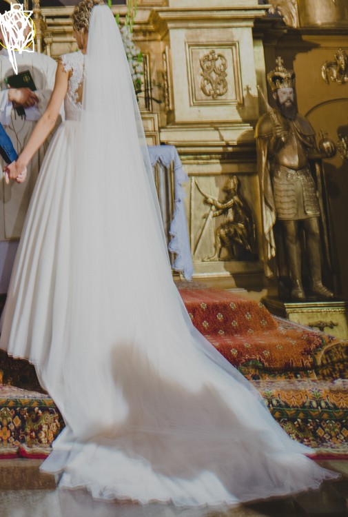 Cudowny długi tren, łatwo podpina się na przezroczystych guziczkach.