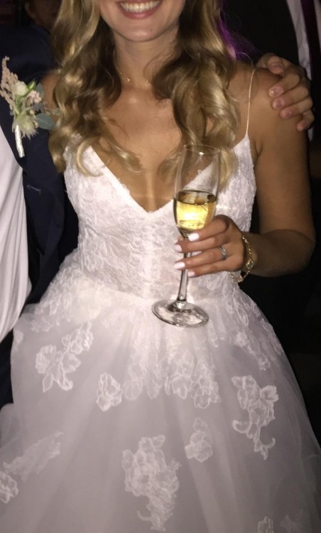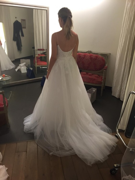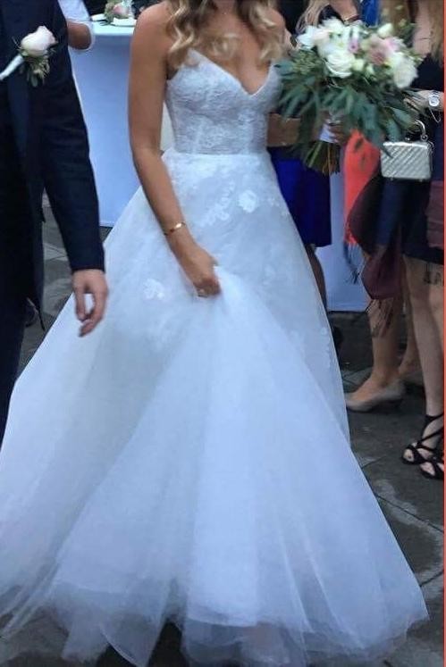 Przepiekna dluga suknia w stylu ksiezniczki od amerykanskiej projektantki gwiazd Monique Lhuillier, model Severine. Kupiona w Paryzu. Rozmiar 36. Identyczny model miala na swoim slubie Amy Schumer. Noszona raz, stan perfekcyjny. Piekny tiul i koronki.