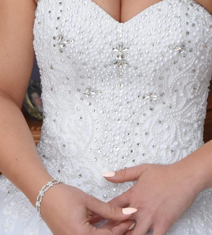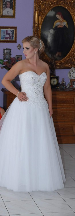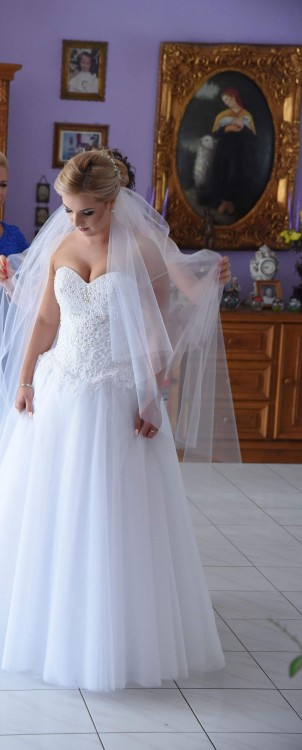 Witam mam do zaoferowania piękną suknię ślubną projektu Grażyny Gawłowskiej. Gorset sukni wysadzany jest kryształkami oraz perłami suknia nie jest na kole przez co nie utrudnienia ruchu ale mimo to suknia układa się bardzo ładne. Rozmiar sukni to 38. Była ona szyta na wzrost 160 cm oraz dodatkowo 10 cm obcas. Sukienka jest Niemal w idealnym stanie nie jest uszkodzona ani zaciągnięta. Suknie Można przymierzyć w Nysie