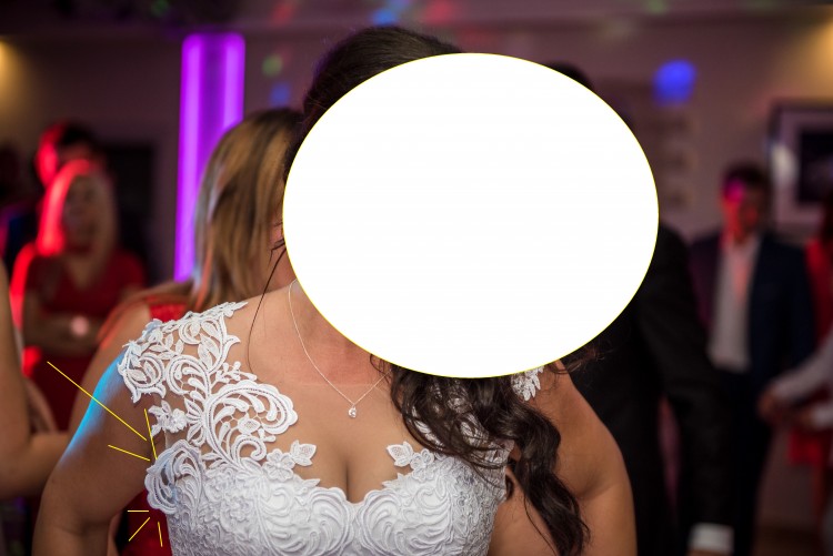Suknia założona jedynie w dzień ślubu:) Rozmiar to 38, ale dzięki gorsetowi będzie również pasować na mniejszy rozmiar i idealnie dopasuje się do ciała. Suknia dopasowana do wzrostu 165 cm + 6 cm obcas. Sukienka wystawiona tak tanio, ponieważ została uszkodzona. Niestety została porwana i w małym stopniu oderwana na samym dole część tiulu w środkowych warstwach więc nie rzuca się to w oczy. Należy podszyć również gipure na gorsecie ponieważ troszke odchodzi( widać na zdjęciu) Wszystko to oczywiście można zrobić bez problemu u krawcowej. Zapraszam do kontaktu, chętnie odpowiem na sms oraz wiadomości na poczcie. Możliwa również wysyłka sukni. Posiadam również NOWE białe bolerko rękawe 3/4 oraz niezniszczone nuty nude rozmiar 39.