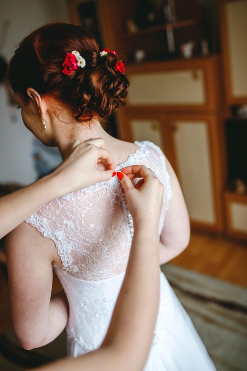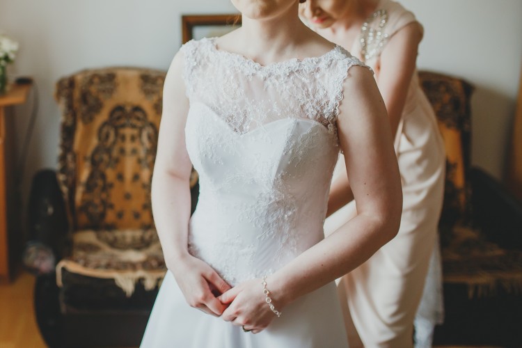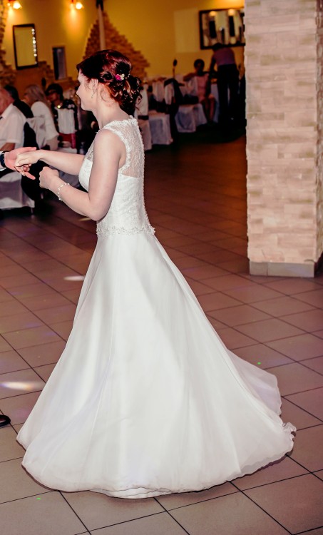 Suknia była szyta na miarę w salonie w Lublinie, na wzrost 155 cm + 9,5 cm obcas.