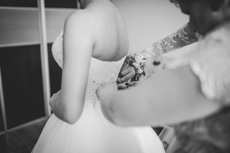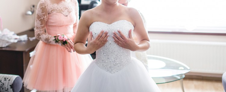 Suknia ma bogato zdobiony gorset z wiązaniem, dół sukni uszyty z kilku lekkich, zwiewnych warstw tiulu.