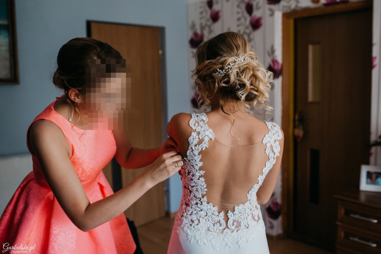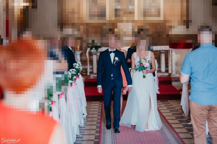 Sprzedam Suknie Ślubną, Bardzo wygodna, delikatna. Suknia jest bardzo lekka i zwiewna - góra na cielistej siateczce pokryta aplikacjami. Dodatkowo doszyta jest warstwa tiulowa z możliwością odpięcia - widoczna na zdjęciu w kościele.
