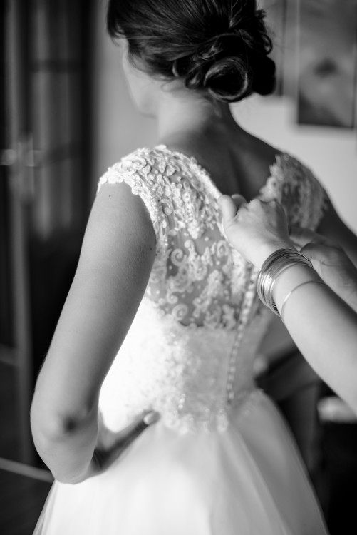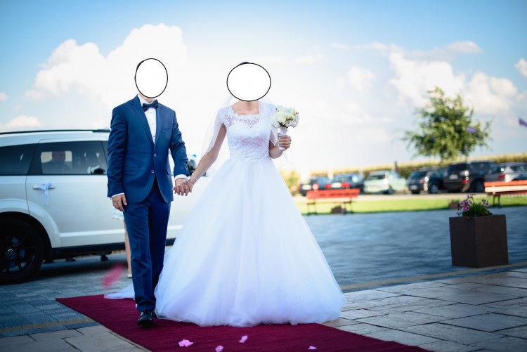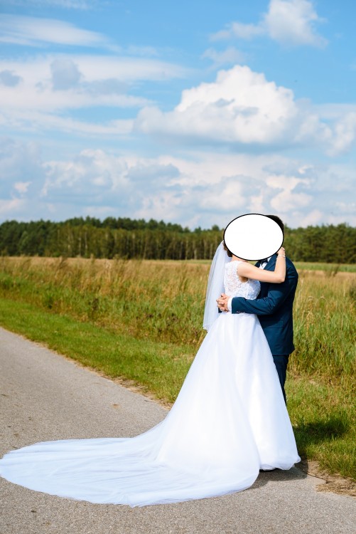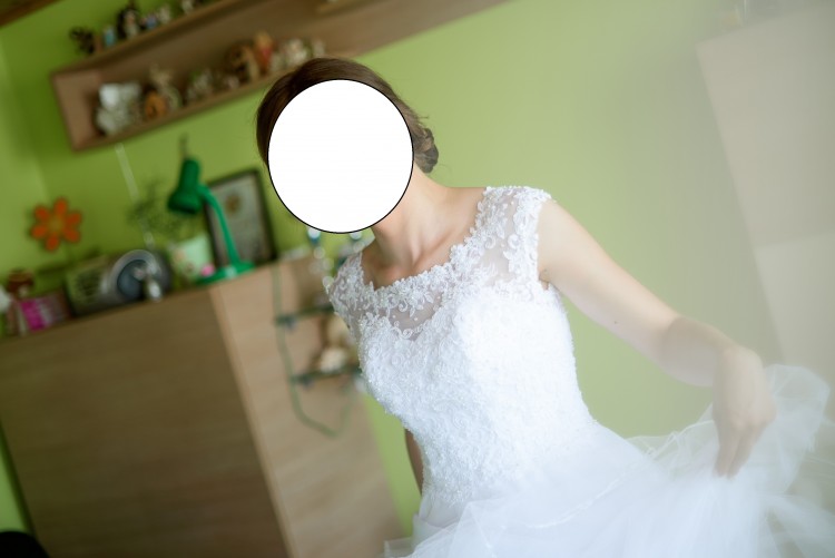 Piękna biała suknia ślubna szyta na zamówienie w kolorze białym- rozmiar 34/36, wzrost 165 + 8 cm obcas. Góra sukienki wykonana z delikatnej koronki, dodatkowo zdobiona małymi diamencikami; z tyłu zapinana na guziki. Suknia składa się z kilku warstw tiulu; posiada tren który jest odpinany w talii ( na dwa zatrzaski). Jest to duże udogodnienie, ponieważ w każdej chwili można odpiąć dodatkową warstwę tiulu - nie jest podpinany na dole sukni jak większość trenów. Suknia doskonale prezentuje się zarówno w wersji z trenem jak i bez niego.