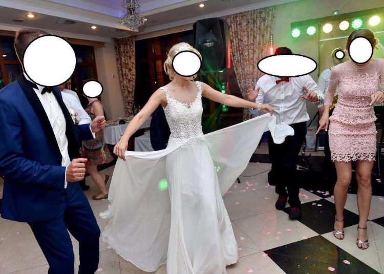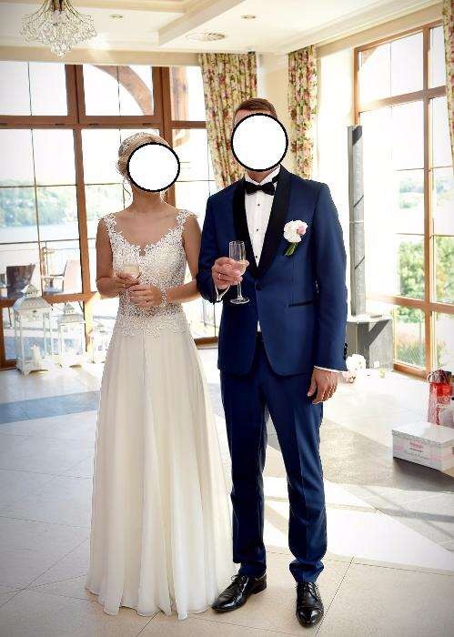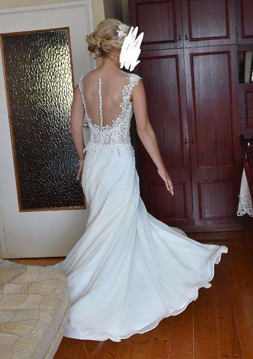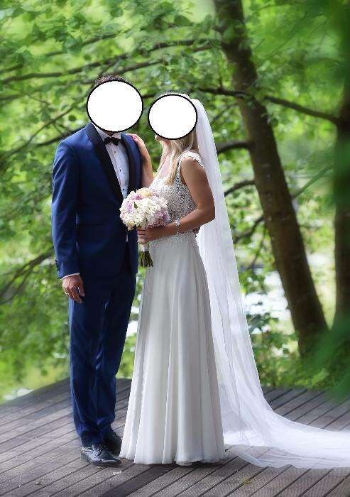 Mam na sprzedaż piękną suknie ślubną z kolekcji Gala 2017, model Sofia. Rozmiar 36. Suknia jest w kolorze ivory, z cielistą siateczką na dekolcie i plecach. Dół sukni wykonany jest z muślinu, a góra pięknie zdobiona, posiada drobne cekiny dlatego przepięknie się błyszczy. Gorset jest delikatnie usztywniony, nie ma potrzeby zakładania biustonosza. Suknia jednoczęściowa zapinana na zamek z ozdobnymi guziczkami. Suknia na wzrost 169cm + obcas 8cm.