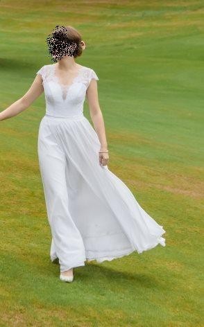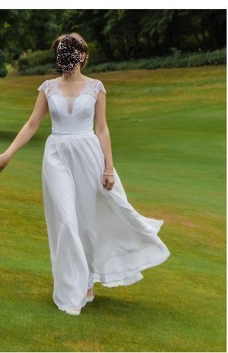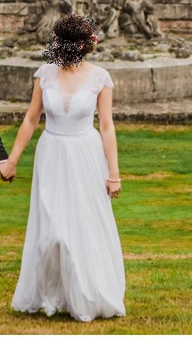 Cena sukni jest wyjątkowo niska ze względu na to, iż dół sukni ( muślin ) został delikatnie naruszony ( zadarty ) obcasem, zniszczenie nie jest duże, nie rzuca się w oczy , jednak bez problemu można np. sukienkę skrócić na osobę niższą lub naszyć aplikację z delikatnej koronki. Sukienkę z łatwością można naprawić ;)