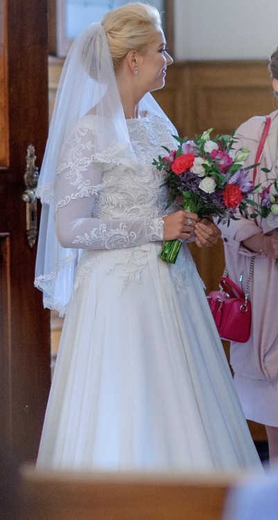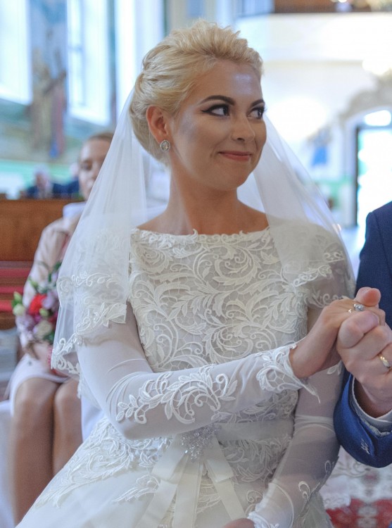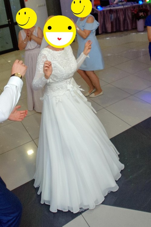 Chętnie sprzedam przyszłej Pannie Młodej wyjątkową suknię ślubną. Model KEIRA w kolorze IVORY (śmietankowa biel) z Salonu Gala w Płocku. Jest w rozmiarze 40 na wzrost 170 cm, ale zachęcam do przymiarki gdyż jest dosyć elastyczna. Jest ona bardzo wygodna dzięki rękawom z sitaki ozdobionym koronką oraz temu że nie ma gorsetu/ usztywnianej góry. Przy nałożeniu Halki (w cenie) zyskuje wyszczuplający kształt litery A. Góra sukni z gipiury, dół wykonany z szyfonu. Na plecach wycięcie w kształcie "V". Cena do małej negocjacji. Wymaga odświeżenia w pralni chemicznej. Serdecznie polecam.