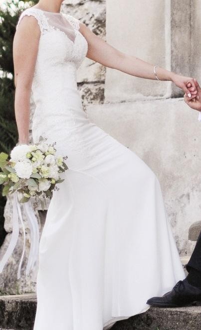 Do sprzedania suknia w kształcie syrenki z pięknym trenem. Góra sukni ozdobiona koronką.Dół sukni gładki. Kolor śmietankowy. Suknia wyczyszczona, gotowa do założenia. Zakupiona w 2017 roku. Do sukni mam buty w rozmiarze 37, kolor ecru. (dorzucam w cenie :)) Cena do negocjacji.