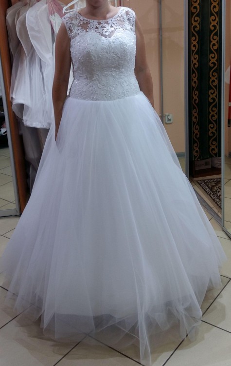 Suknia szyta na miarę. Rozmiar 44/46 ale pasuje też na 42 i większy. Suknia dopasowana do wzrostu 160 cm + 7 cm obcas. Suknia ubrana tylko 2 razy (ślub i sesja), wyczyszczona w profesjonalnej pralni.