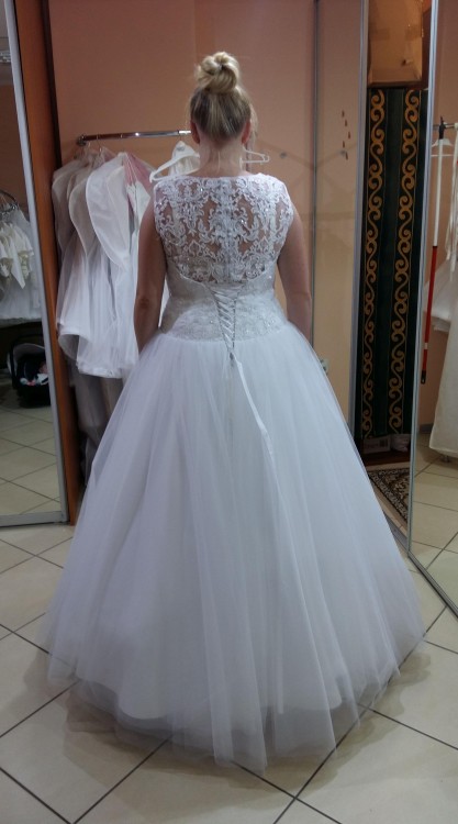 Góra sukni to dopasowana do ciała koronka, która pięknie podkreśla biust. Dół sukni tworzy zwiewny tiul, który pięknie układa się w tańcu.