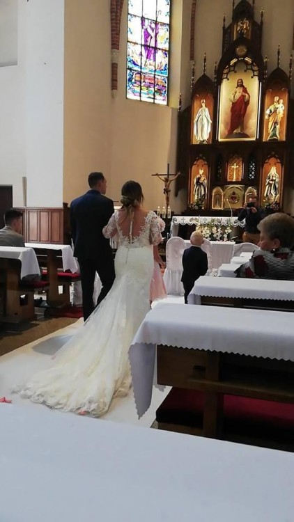 Witam sprzedam piękna suknie ślubna z najnowszej kolekcji .Zakupiona w Anglii.Suknia jest rozmiaru 40-42 wzrost 157 +obcas 8cm .Suknia jest wyprana .Ma długi podpinany tren.