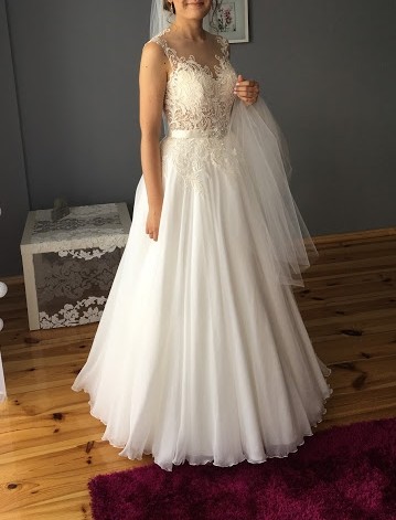 Suknia jest w rozmiarze 36. Szyta na rozmiar 164 + 8cm obcasów. Jeżeli założymy ją bez koła będzie dobra również na wyższą przyszłą Pannę Młodą. Na weselu suknia miała założone koło, na sesji plenerowej była bez koła, dla porównania można zobaczyć na zdjęciach jak wygląda z kołem i bez koła.