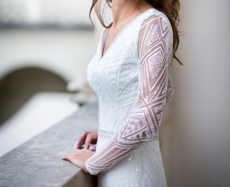 Suknia z przepięknymi długimi rękawami i odkrytymi plecami, zdobiona oryginalną, niepowtarzalną koronką. Dół z dwóch warst materiału, piękny długi tren podpinany z tyłu na guziczek. Suknia posiada wszyte miseczki.