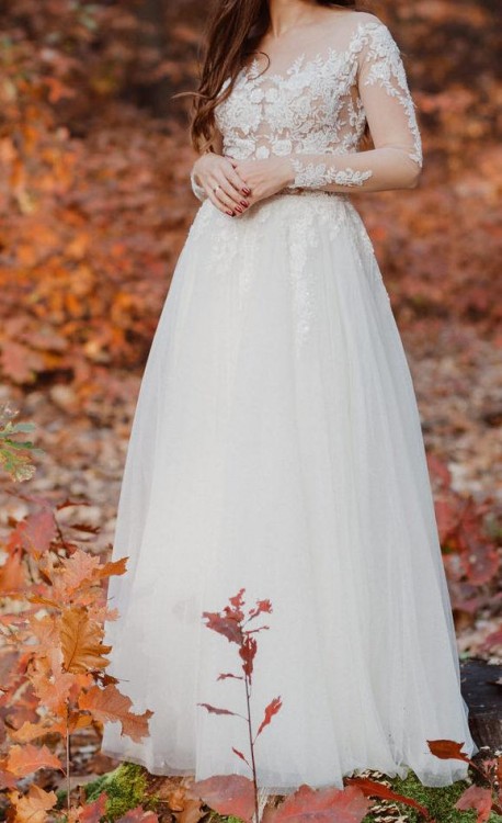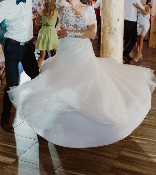 Mam do sprzedania bardzo lekką i zjawiskową suknię ślubną. Kolor ivory, dobra na wzrost 168 cm + obcas ok 10 cm. bez problemu można ją łatwo skrócić u krawcowej. Suknia jest bardzo lekka, ponieważ ma jedynie dwie warstwy materiału i na to dwie warstwy delikatnego szyfonu/tiulu miękkiego i przyjemnego w dotyku, nie jest to typowy sztywny tiul. Jest szyta z koła, ma dużo materiału przez co pięknie się układa. Góra natomiast to ciałowa siateczka na której są przyszyte koronkowe aplikacje dodatkowo ozdobione deliaktnymi koralikami i cekinami. W pasie jest wszyty pasek wyszyty tymi samymi koralikami, które są na koronkowych aplikacjach. Wygląda to bardzo elegancko i piękne podkreśla talię. Zapinana na guziczki, które super się trzymaja, ani jeden podczas tańczenia się nie rozpiął. W sukni jest wszyty ciałowy stanik typu push-up, także bielizna jest niewidoczna i nie ma potrzeby zakłądania innego stanika.