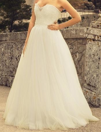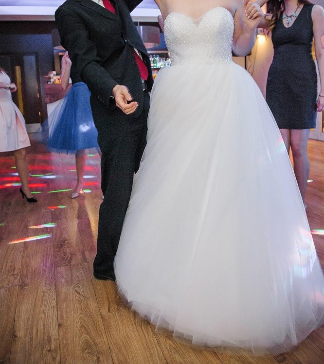 Suknia jest przepiękna i robi ogromne wrażenie. Posiada kilka warstw tiulu, w tym jedną błyszczącą. Można ją założyć z kołem lub bez - koło jest dołączone w zestawie.