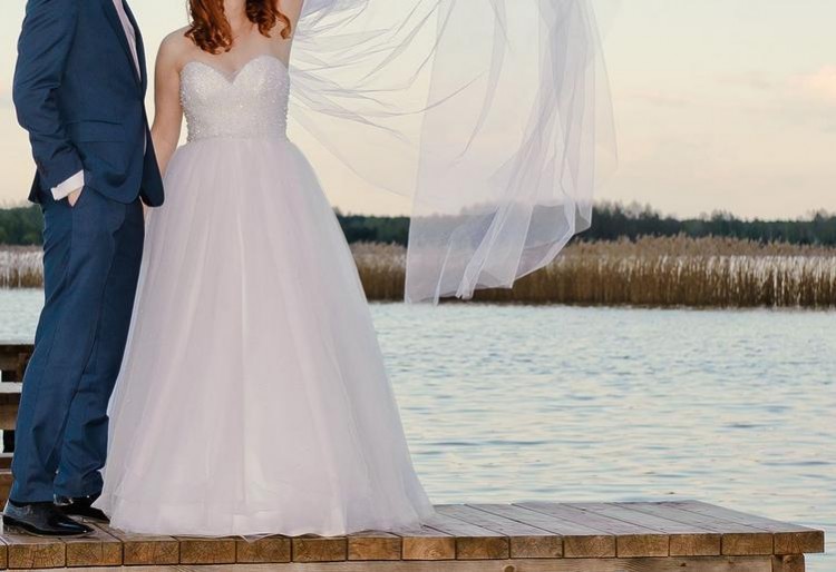Ma niewielkie przedarcia tiulu na dole sukni, które są mało widoczne.