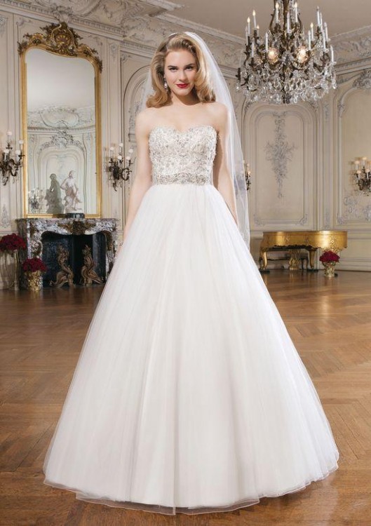 Piękna tiulowa suknia princeska z dekoltem w serduszko i gorsetem wysadzanym koralikami.