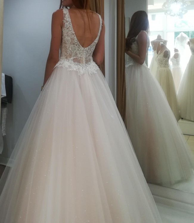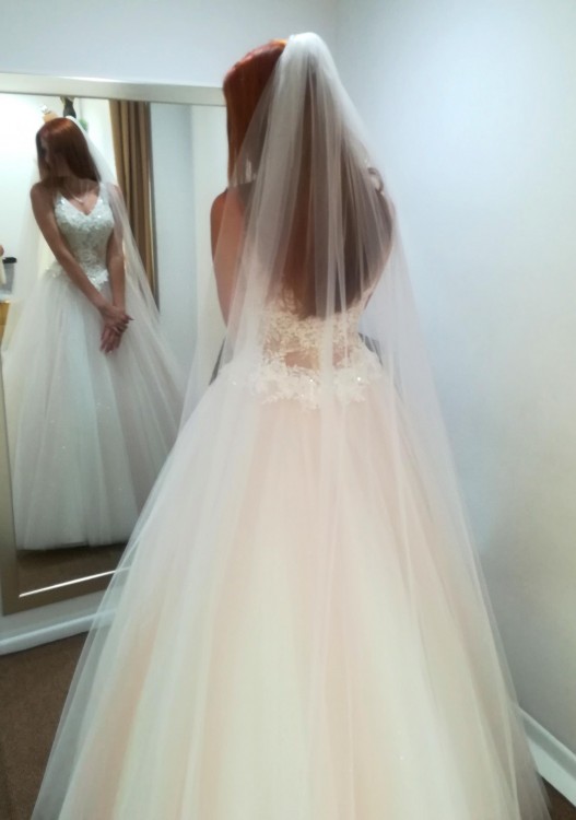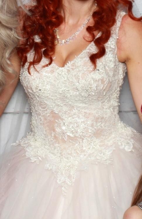 Suknia szyta na rozmiar 34/36 (wiązany gorset) i wzrost 175cm + 9cm szpilki. Możliwość skrócenia warstw tiulu :)