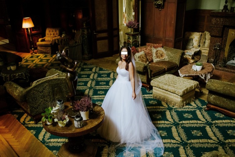 Gorset sukni zdobiony delikatnie mieniącymi się kryształkami. Suknia posiada kilka warstw bardzo dobrej jakości tiulu. Suknia jest po praniu chemicznym, bez uszkodzeń.